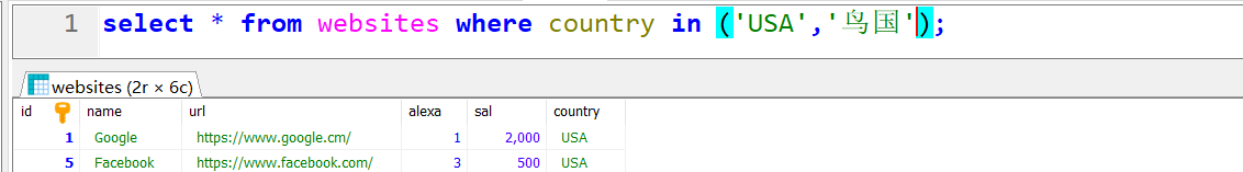 1 | select * from websites where country in ('USA','鸟国','CN'); |